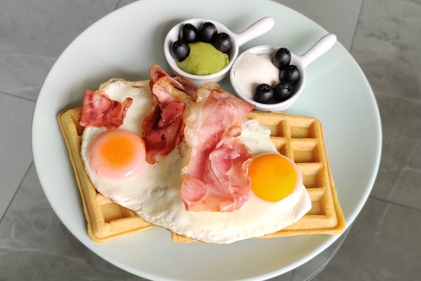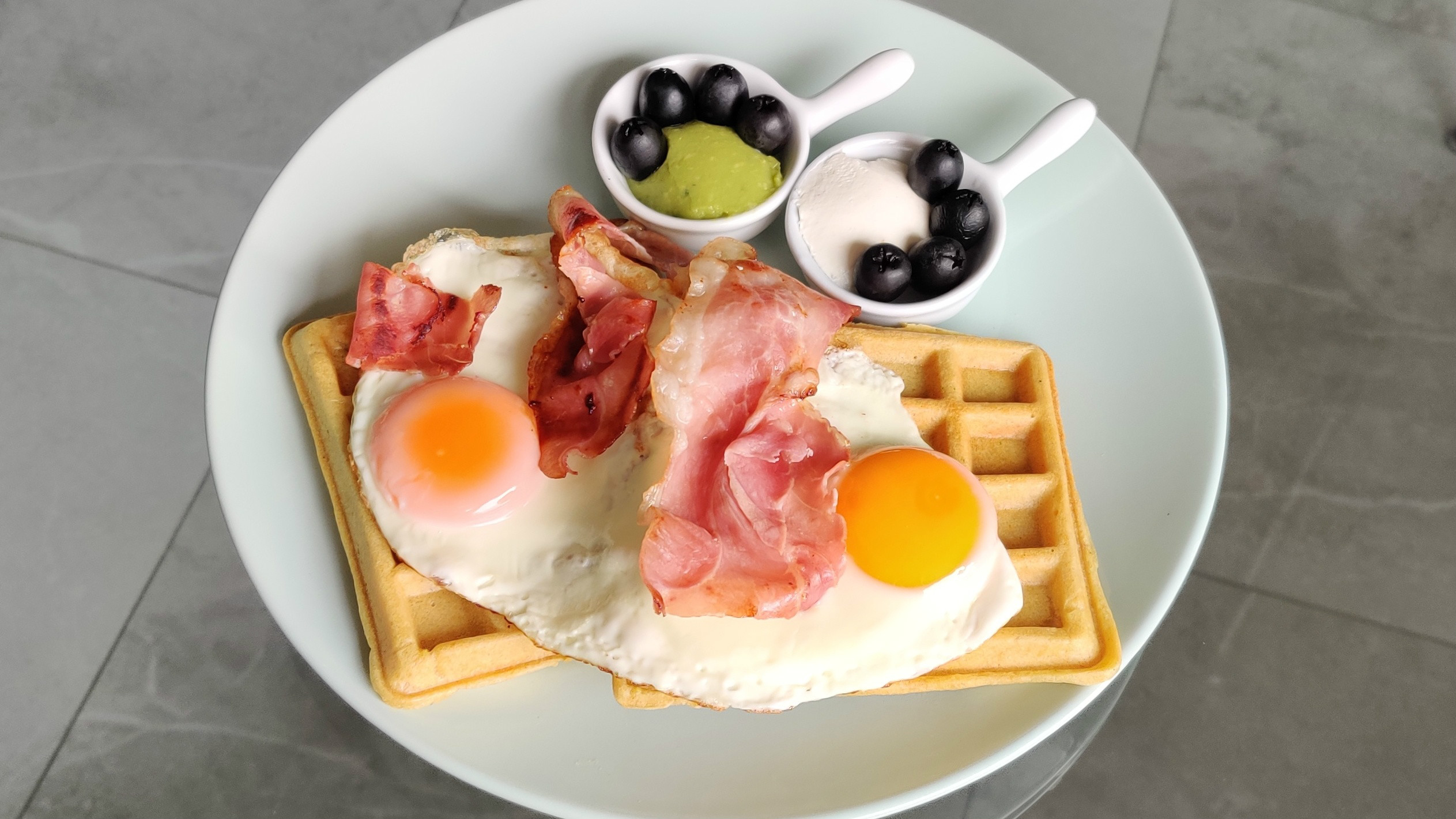 Aby wyregulować kaloryczność posiłku możesz dodać do gofra kolejne jajko sadzone (75 kcal) lub plaster szynki (25 kcal).