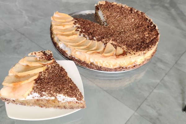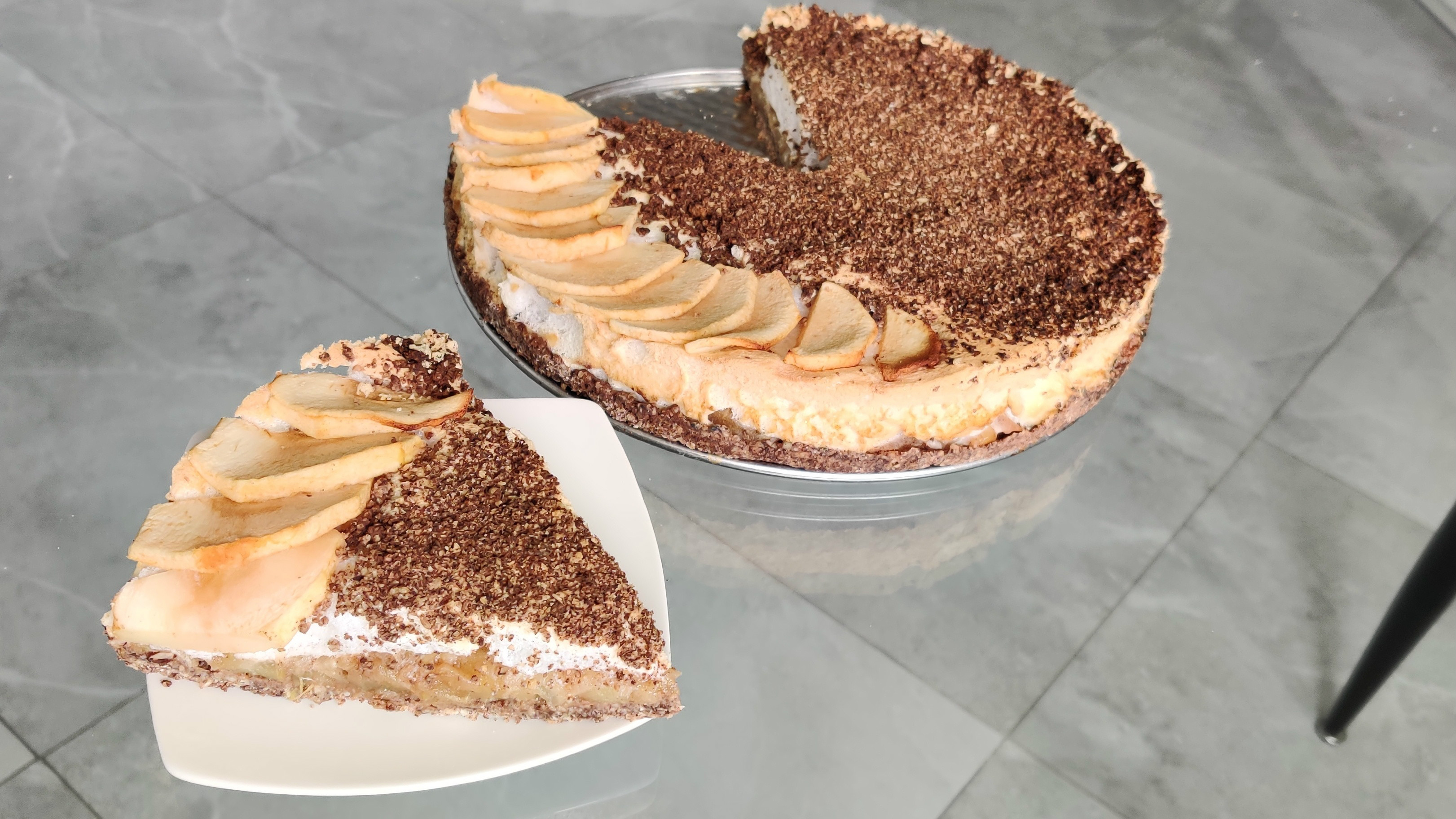 Białka jaj oddzielamy od żółtek i odstawiamy na później. Mielimy płatki owsiane, przekładamy do miski, dodajemy żółtka, nierozpuszczony olej kokosowy, 70 g erytrytolu (30 g zostawiamy do ubicia białek i 20 g do jabłek) i 10 g kakao. Całość ugniatamy do uzyskania jednolitej masy. Od całości masy oddzielamy kulkę 50 g na kruszonkę. Kulkę wstawiamy do zamrażalnika na 30 min. Dół tortownicy wykładamy papierem do pieczenia i równomiernie rozkładamy na nim przygotowaną masę. Tortownicę wkładamy na 30 min do lodówki. Jabłka obrać, usunąć z nich gniazda nasienne i pokroić w kostkę. Następnie przełożyć je na patelnię, dodać 20g erytrytolu, 2 łyżki mielonego cynamonu i podlać wodą 150 ml. Smażyć do uzyskania miękkości, schłodzić.