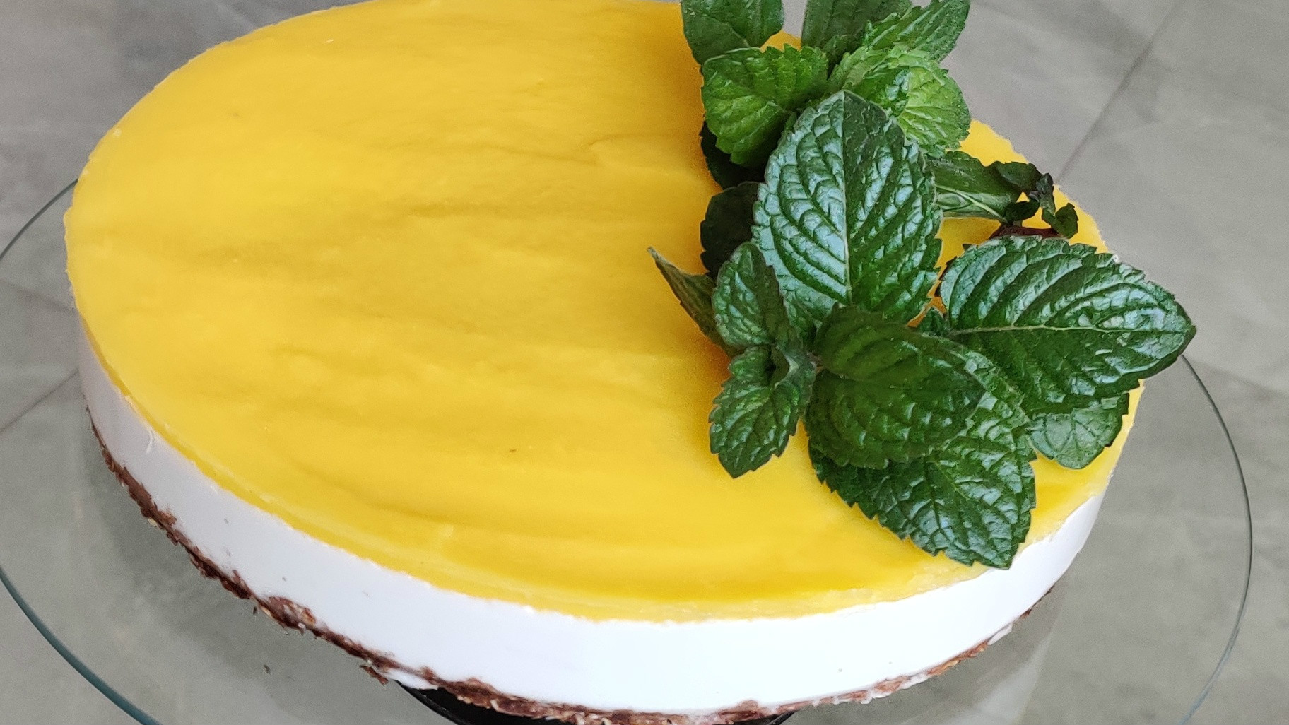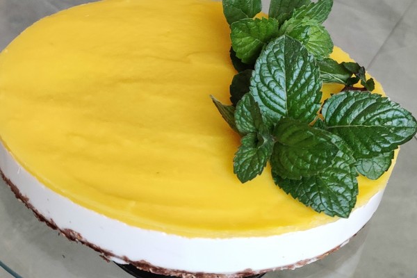 Ostatnią warstwę sernika stanowi mus mango. 500 g zmiksowanego mango umieszczmy w granku, podgrzewamy i dodajemy 15 g żelatyny również mieszając. Ostudzony mus wykładamy jako górę sernika i ostatni raz umieszczamy całość w lodówce na 30 min.