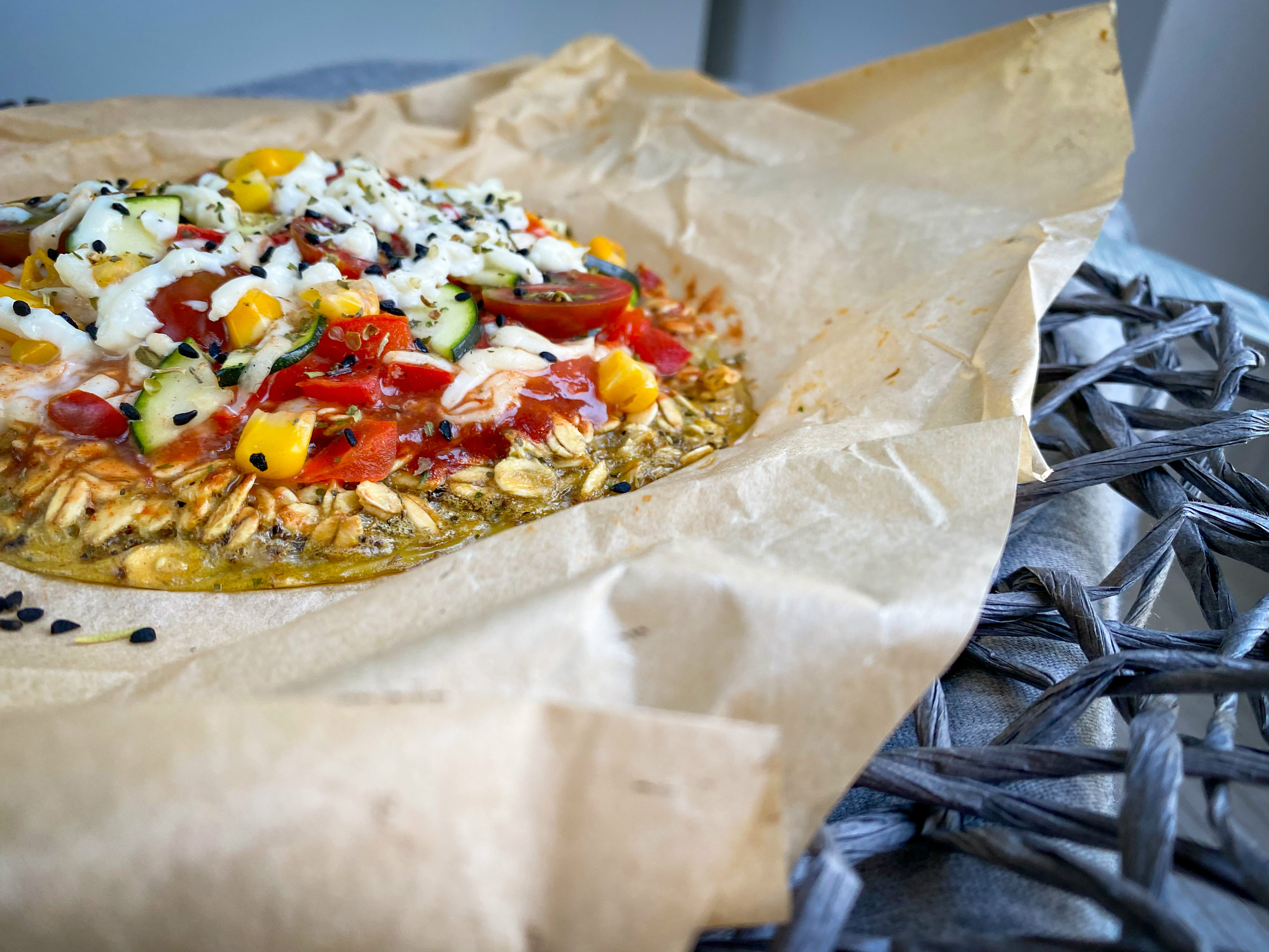 W miseczce mieszamy płatki owsiane z mąką oraz proszkiem do pieczenia. Wbijamy jajko, dolewamy oliwę z oliwek, wodę oraz doprawiamy oregano, bazylią oraz szczyptą soli. Masę dokładnie mieszamy i przekładamy do małej, okrągłej formy wyłożonej papierem do pieczenia. Ciasto wstawiamy do piekarnika rozgrzanego do 180℃ i pieczemy przez 10 minut.