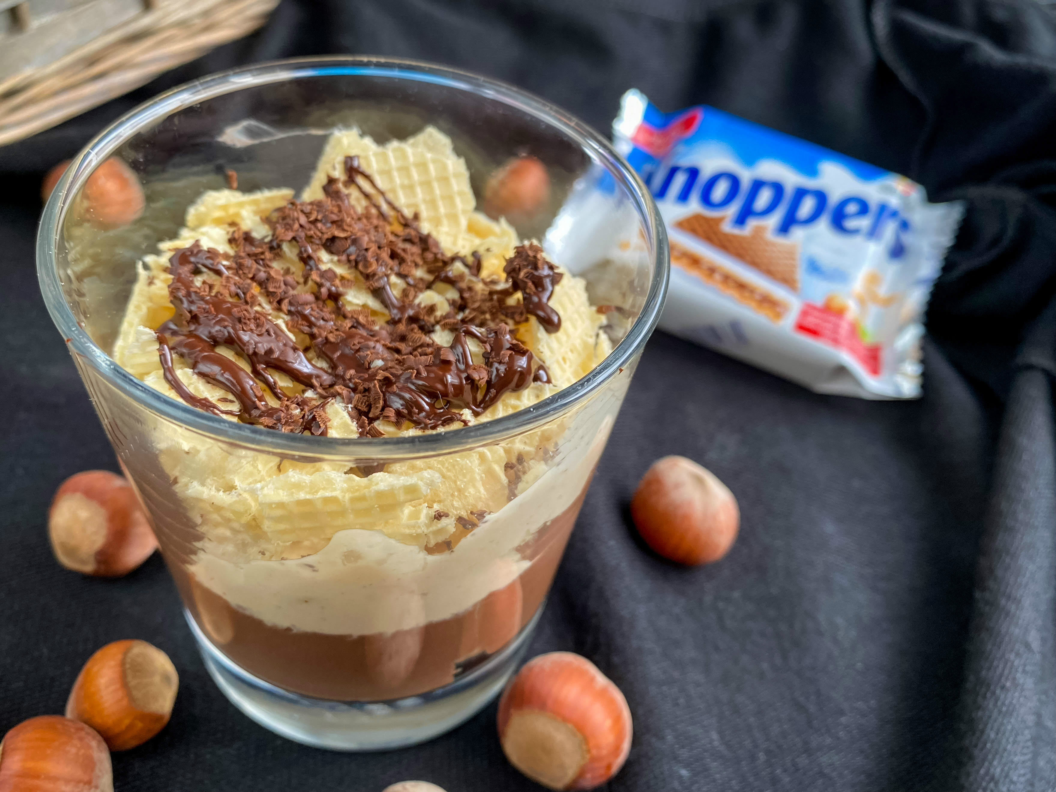 W naczyniu umieszczamy warstwami: pokruszony na małe kawałki wafelek, masę czekoladową, ponownie pokruszony wafelek, masę orzechową wymieszaną z pokrojonymi na małe kawałki orzechami laskowymi, wafelek, a górę polewamy rozpuszczoną kostką gorzkiej czekolady.