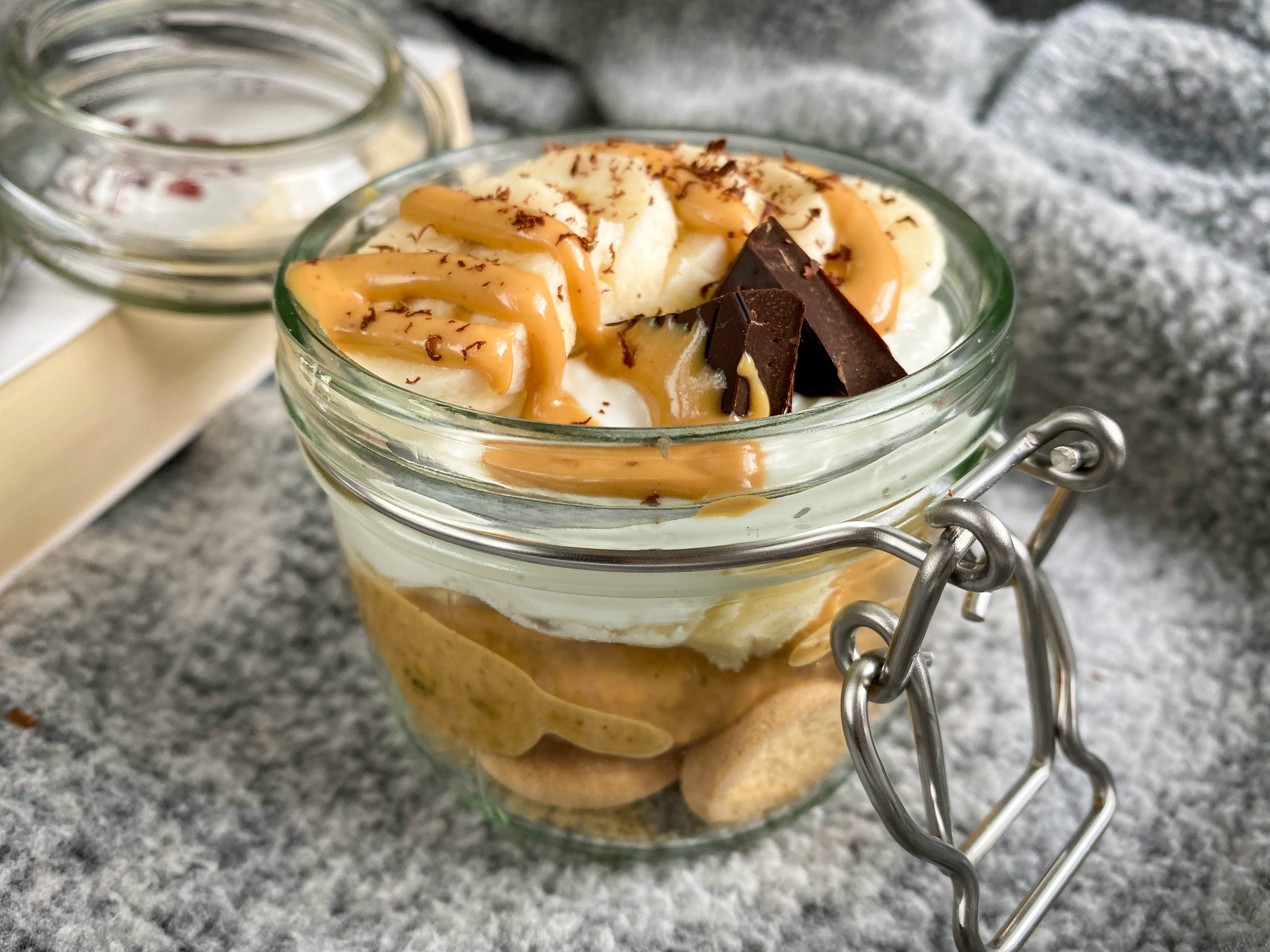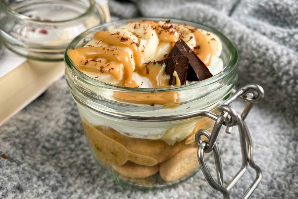 W małym naczyniu układamy warstwami: biszkopty, "fit karmel", czyli masę daktylową, następnie jogurt, a na górze układamy pokrojonego na małe kawałki banana.