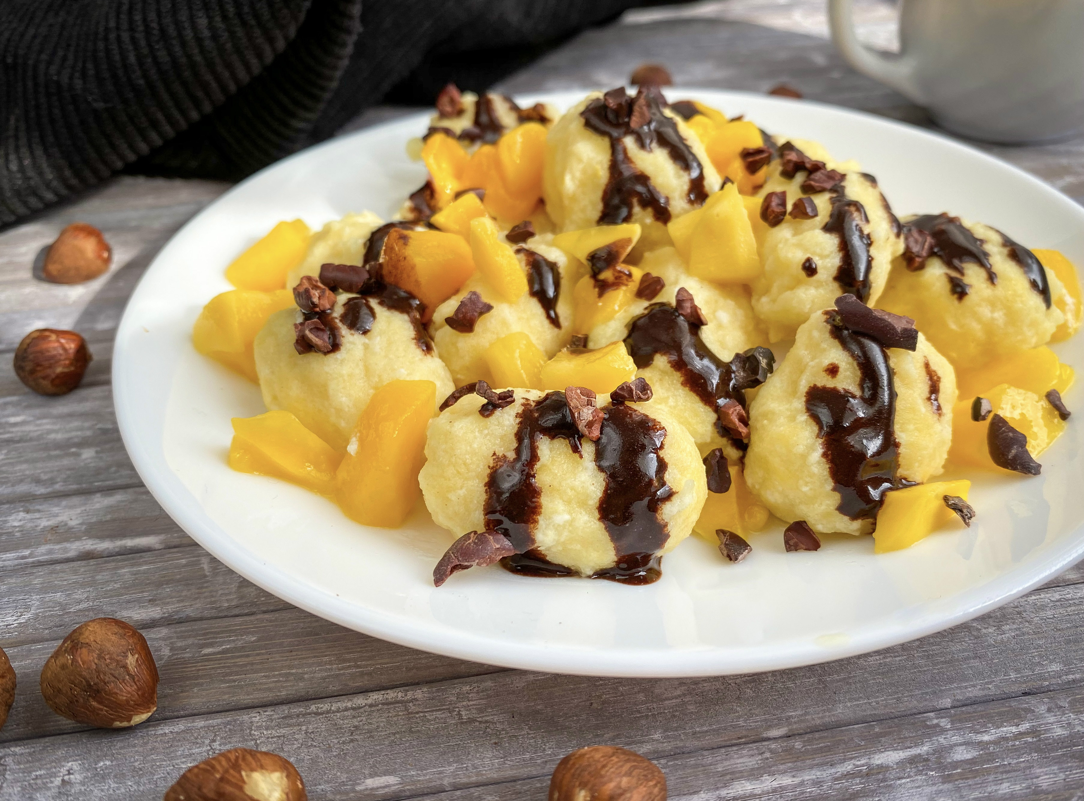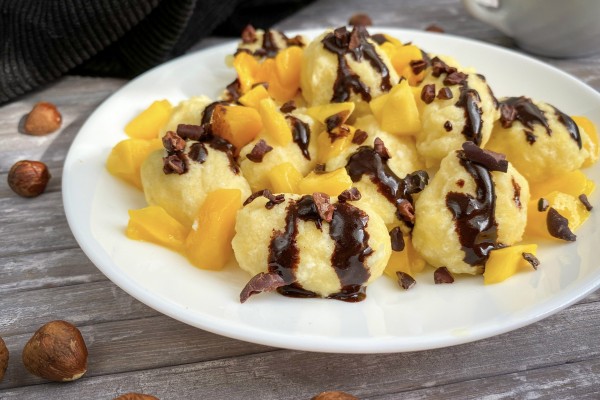 Gotowe twarogowe kluski ozdabiamy pokrojonym na małe kawałki mango, polewamy "białkową czekoladą" i posypujemy ziarnami kakao bądź gorzką czekoladą.
