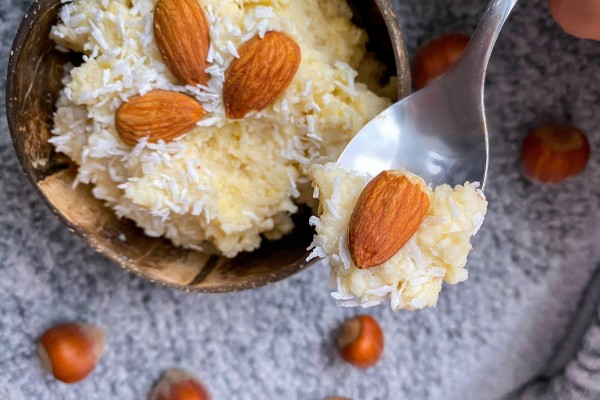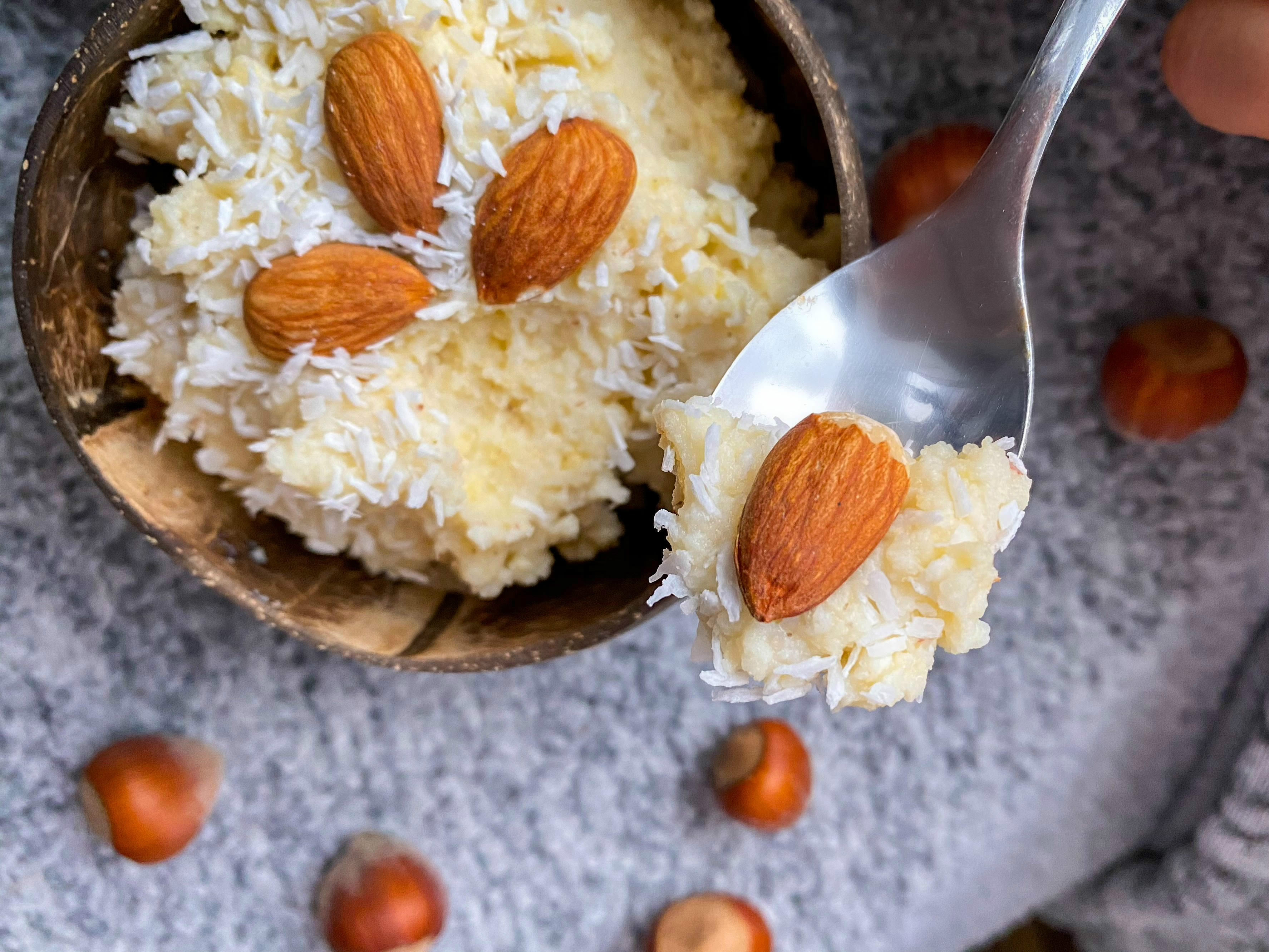 Do miski przesypujemy kaszę, dorzucamy wiórki kokosowe, 20 g migdałów i całość blendujemy na gładki krem. Następnie dodajemy odżywkę białkową, jogurt (cały czas miksując) i dolewamy stopniowo napój kokosowy, ok. 40 ml, do uzyskania konsystencji kremu.