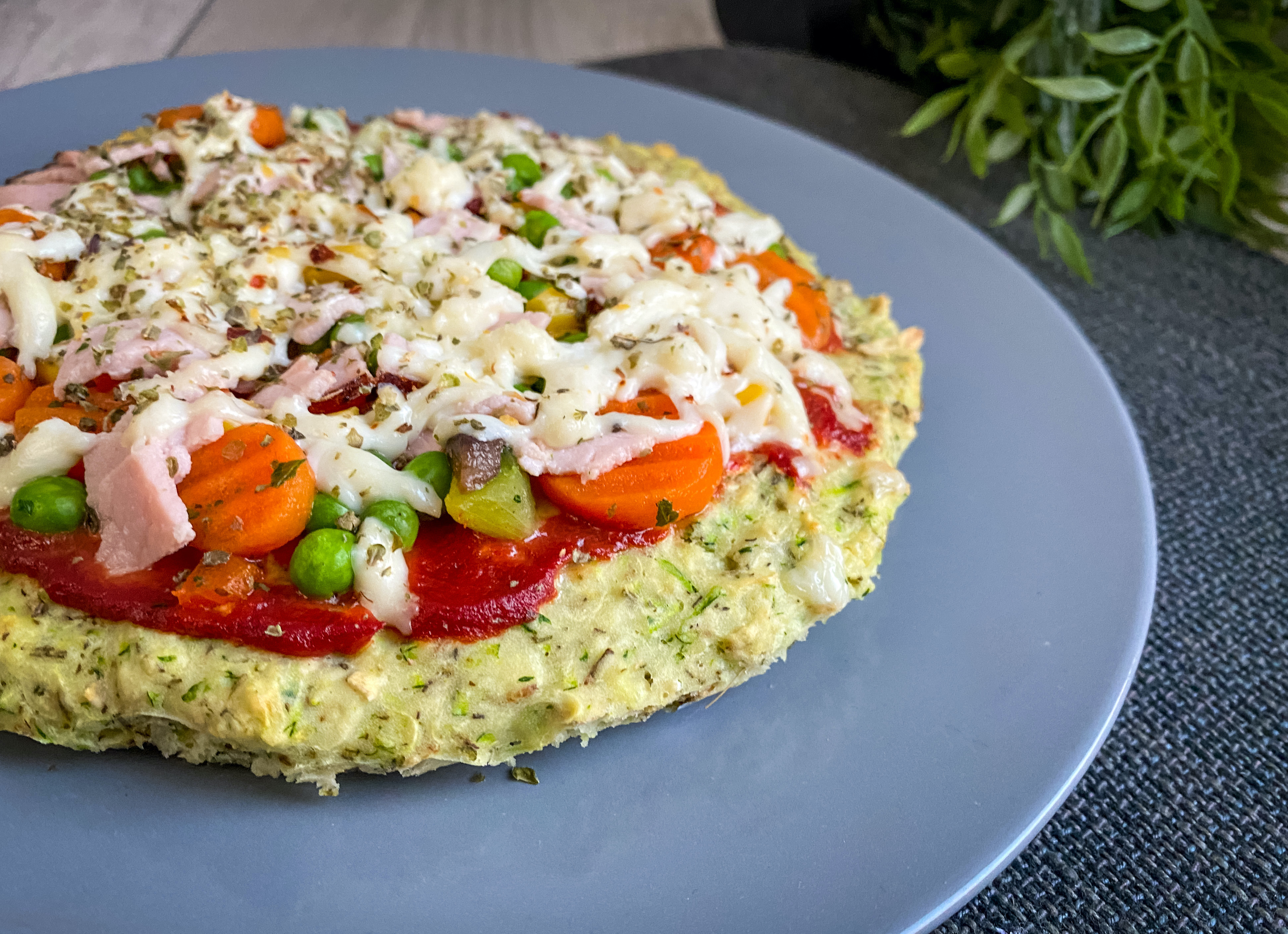 Gdy spód pizzy będzie upieczony, smarujemy górę sosem pomidorowym, układamy groszek i kukurydzę, pokrojoną w drobną kostkę szynkę oraz zieloną paprykę i pokrojoną w talarki marchewkę. Całość posypujemy potartą na dużych oczkach mozarellą. Górę oprószamy oregano.